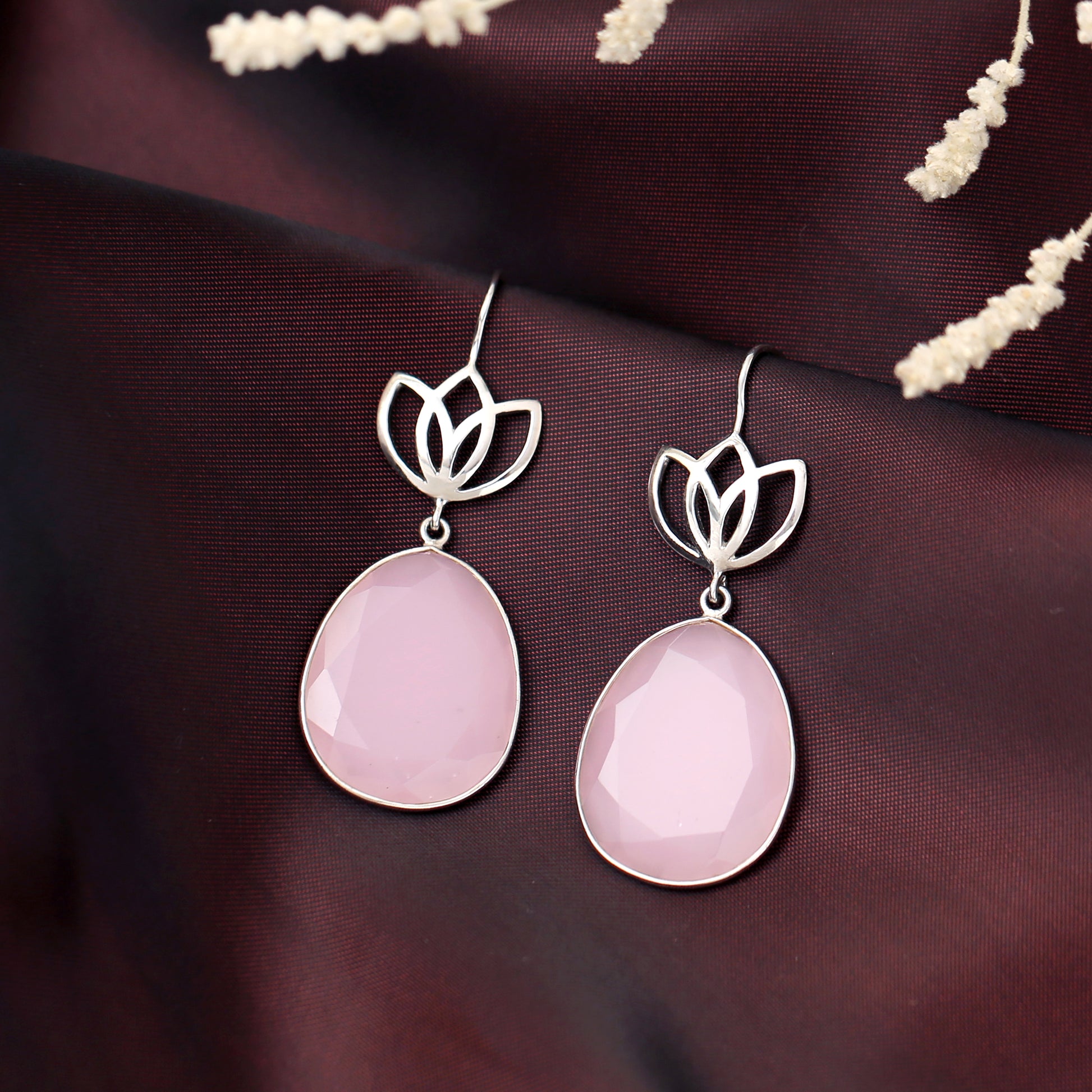 Channel pure elegance with these stunning lotus earrings. They feature a large, beautifully faceted pink gemstone, cut in a classic teardrop shape, dangling gracefully from an intricate silver lotus flower design. This pair perfectly balances nature-inspired charm with sophisticated style.